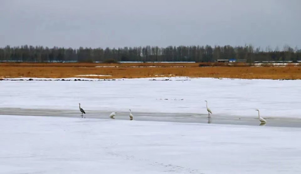 在雁窩島國家級生態(tài)濕地自然保護(hù)區(qū)內(nèi)的冰面上,白鸛、灰鸛還有小水雞,三五一組,有的悠閑散步,有的仰頭眺望,有的在融化的雪水中覓食,還有的在低空盤旋。比往年提前10天到來的候鳥,為雁窩島增添了初春的氣息和生機。