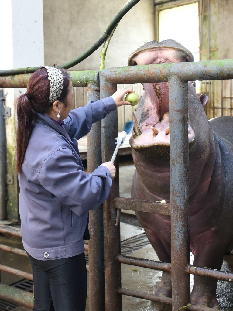 工作人員為河馬刷牙