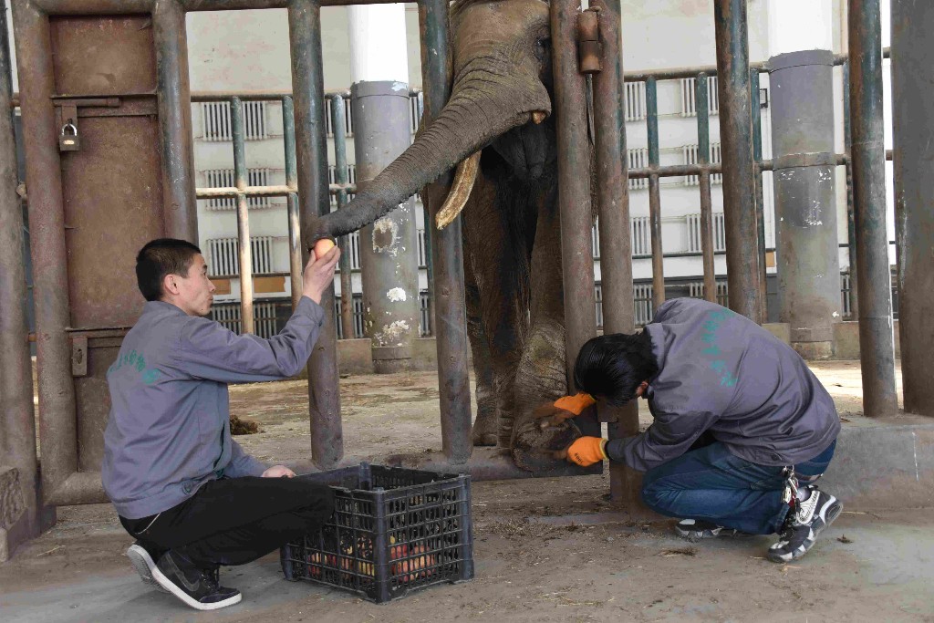 工作人員為非洲象修腳
