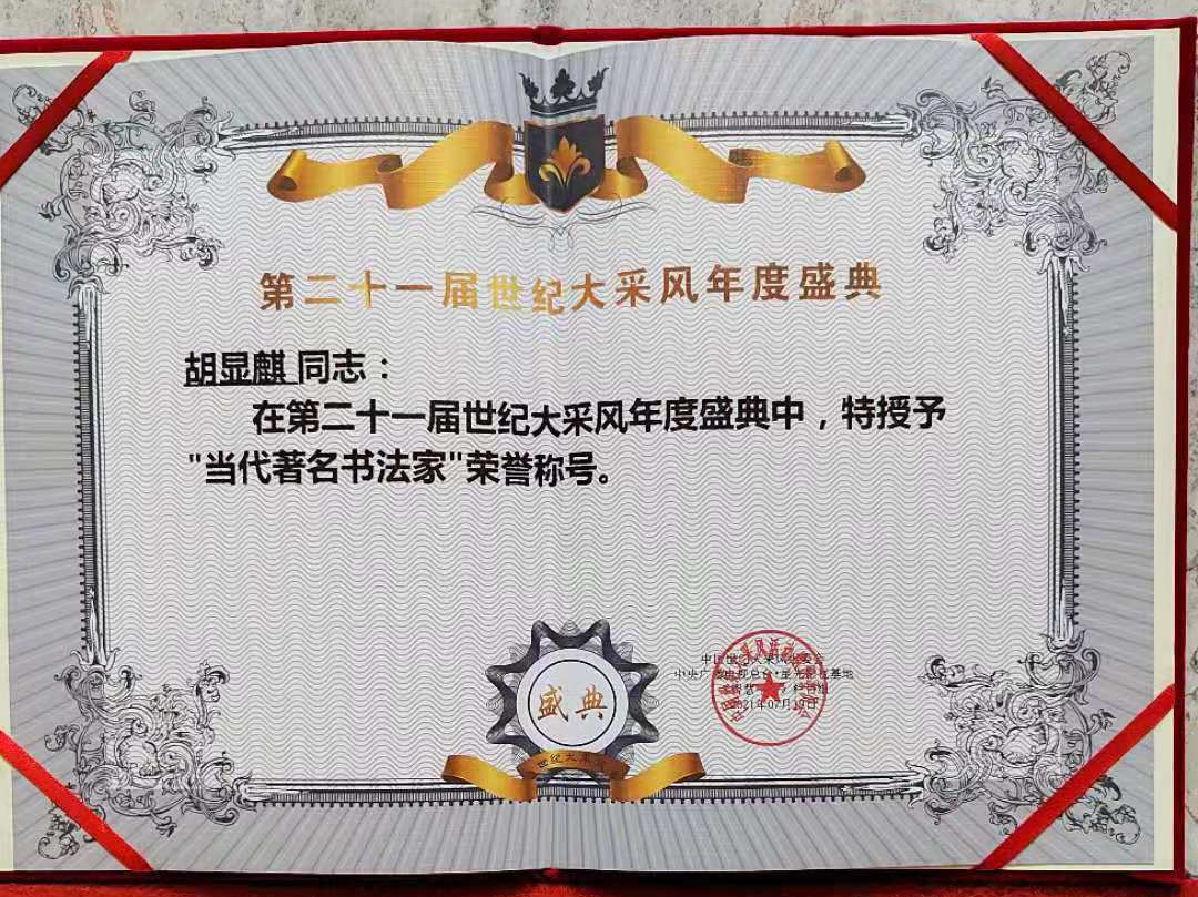 在第二十一屆世紀(jì)大采風(fēng)年度盛典中,特授予“當(dāng)代著名書法家”榮譽(yù)稱號(hào),多次參加在海南三亞和北京全國政協(xié)大禮堂舉行的頒獎(jiǎng)典禮。