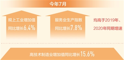 工業(yè)、服務(wù)業(yè)穩(wěn)步增長。7月,全國規(guī)模以上工業(yè)增加值同比增長6.4%,全國服務(wù)業(yè)生產(chǎn)指數(shù)同比增長7.8%,均高于2019年、2020年同期增速;中國制造業(yè)采購經(jīng)理指數(shù)為50.4%,服務(wù)業(yè)商務(wù)活動指數(shù)為52.5%,均連續(xù)17個月高于臨界點(diǎn);服務(wù)業(yè)業(yè)務(wù)活動預(yù)期指數(shù)為60.1%,持續(xù)位于較高景氣區(qū)間。