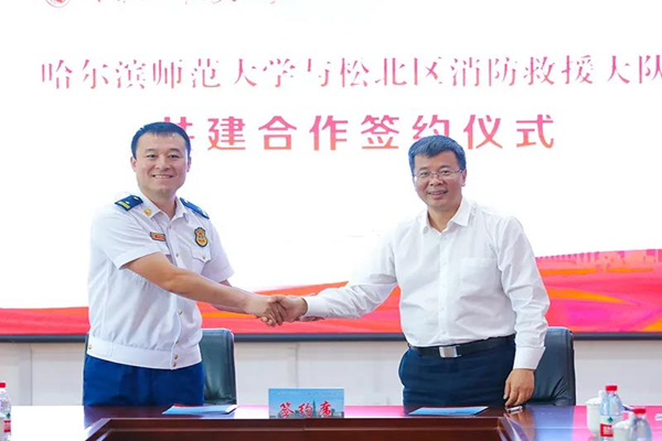 雙方代表簽署《哈爾濱師范大學(xué)與松北區(qū)消防救援大隊(duì)共建合作框架協(xié)議書(shū)》