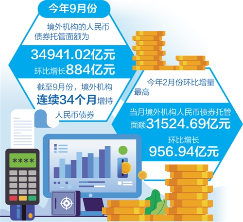 境外機(jī)構(gòu)對人民幣債券熱情持續(xù)高漲。數(shù)據(jù)顯示,9月份境外機(jī)構(gòu)人民幣債券托管面額為34941.02億元,較8月份增加884億元,環(huán)比增量創(chuàng)今年3月份以來新高。截至9月份,境外機(jī)構(gòu)已連續(xù)34個月增持人民幣債券。
