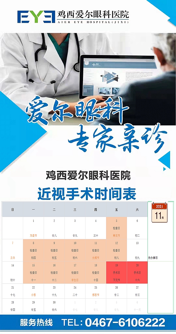 雞西愛爾眼科醫(yī)院近視手術時間表: