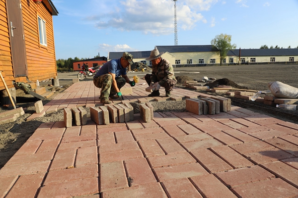 阿木爾林業(yè)局職工為龍河林場驛站民宿鋪地磚(王力 攝)