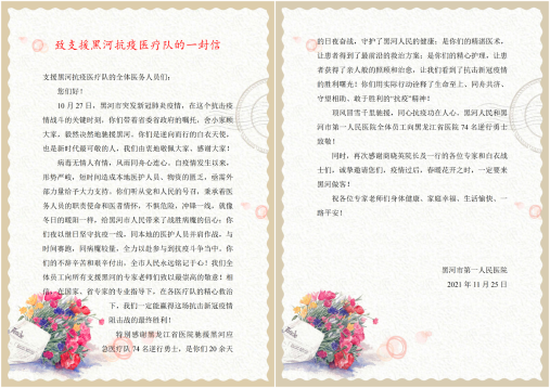 據(jù)介紹,省醫(yī)院支援黑河應(yīng)急醫(yī)療隊(duì)共收治新冠肺炎患者69人,其中重癥1例,最小的患者2歲,最大的患者90歲,在兄弟單位接手前,共治愈出院35人。治療期間,醫(yī)療隊(duì)收到了多封患者表?yè)P(yáng)信,小患者們則用畫筆表達(dá)了對(duì)天使們的感謝與敬仰,有的未出院患者聽說省醫(yī)院醫(yī)療隊(duì)要離開了,都依依不舍,紛紛表達(dá)對(duì)醫(yī)療隊(duì)精湛的醫(yī)技和暖心醫(yī)療的感謝。