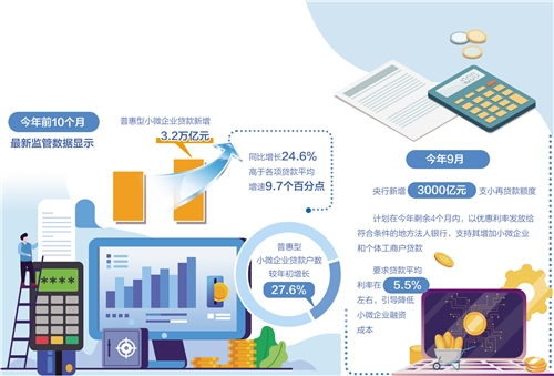 最新監(jiān)管數(shù)據(jù)顯示,今年前10個月,普惠型小微企業(yè)貸款新增3.2萬億元,同比增長24.6%,高于各項貸款平均增速9.7個百分點;普惠型小微企業(yè)貸款戶數(shù)較年初增長27.6%。
