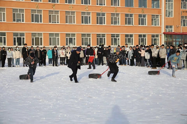 組織開展拉輪胎跑比賽。拉輪胎跑比賽在各年級間進(jìn)行,每班6名選手,50米往返,以時(shí)間少者為勝。隨著裁判老師一聲令下,比賽開始,選手們立馬拉起了輪胎奮力向前沖刺,克服雪地不利的條件,參賽選手飛快地向終點(diǎn)奔跑,掌聲、加油聲響徹操場。冬日的操場上,一個(gè)個(gè)