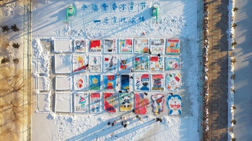 雪后的籃球場(chǎng),變身為學(xué)生們的巨型畫板,大家在這里以“迎接建黨100周年”、“迎接北京2022冬奧會(huì)”為主題,在雪地上涂鴉,把雪后的校園裝扮得與眾不同。學(xué)生們發(fā)揮想象,用色彩描繪出更快、更高、更強(qiáng)的奧林匹克精神,以涂鴉展現(xiàn)著當(dāng)代中學(xué)生的青春風(fēng)采。