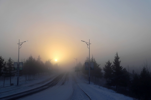早晨7點30分,阿木爾林業(yè)局天剛蒙蒙亮,遠處的群山不見了蹤影,籠罩在寒霧當中,附近的建筑物影影綽綽,仿佛仙境一般,這種寒霧天氣被百姓成為“冒白煙”。