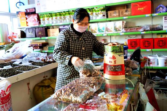 藍領(lǐng)山特產(chǎn)品店經(jīng)營業(yè)主高桂杰正在為客戶備貨。