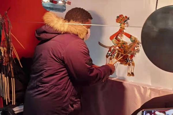 在望奎民間藝人表演的皮影戲現(xiàn)場(chǎng),留學(xué)生們紛紛舉起手機(jī)拍照留念,并發(fā)出了陣陣贊嘆。“皮影是用驢皮制作上色的,大家猜猜它是男生還是女生?”對(duì)外漢語(yǔ)系教師張明明帶領(lǐng)留學(xué)生來(lái)到皮影戲的后臺(tái),講解皮影的制作工藝和皮影劇的來(lái)歷。留學(xué)生們被皮影戲深深吸引,聽(tīng)得津津有味,并親自操作體驗(yàn)了一下。