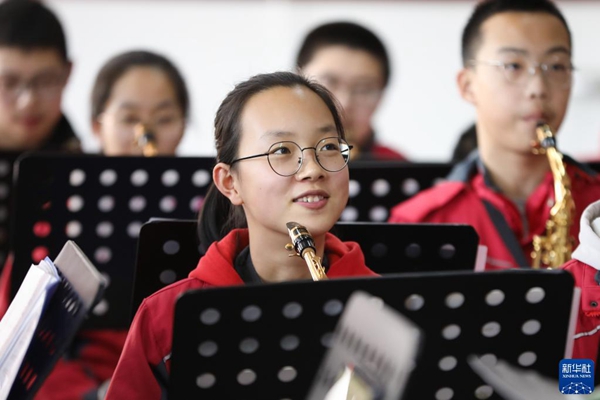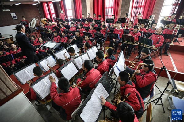2022年寒假,在甘肅省白銀市會寧縣,會師中學交響管樂團的孩子們在完成寒假作業(yè)之余排練《紅旗頌》。早在2011年,會寧縣會師中學就東挪西借組建了第一個交響樂樂團。平時,學校為樂團的學生免費上樂器課,學生自愿報名參加、自愿購買小型樂器。如今,《紅旗頌》《長征組歌》等已成為樂團的保留曲目。