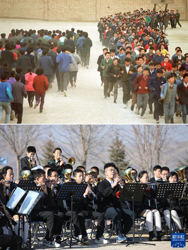 拼版照片:上圖為2001年,會寧縣二中學生跑步鍛煉身體(新華社記者 武斌 攝);下圖為2022年1月19日,會寧縣會師中學交響管樂團學生在戶外表演交響樂(新華社記者 馬希平 攝)。