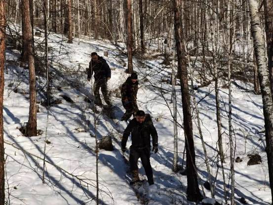 呼中林業(yè)局森林資源管理科工作人員在密林中進行“三清”巡護(劉玉龍 攝)