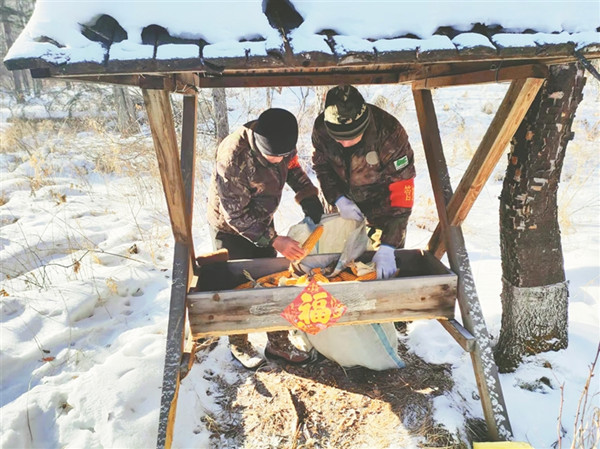 同一時間,青山林場的巡護(hù)隊員來到53林班補飼點,貼福字,送“年貨”?!斑@過年了,狍子野豬的食物也得提檔升級。咱們過年吃餃子,它們也得吃點好的?!标爢T王振林邊擺放著玉米、豆餅粉、白菜、蘿卜等食物邊調(diào)侃著。