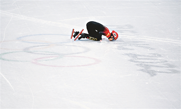 13日,我省選手范可新在比賽后親吻冰面。 新華社發(fā)