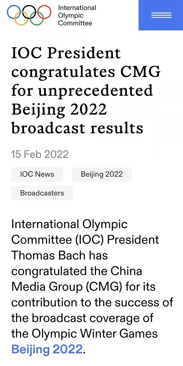 據(jù)國際奧委會官方網(wǎng)站2月15日消息:國際奧委會主席托馬斯·巴赫對中央廣播電視總臺為成功轉(zhuǎn)播報(bào)道2022年北京冬奧會所做出的貢獻(xiàn)表示祝賀。