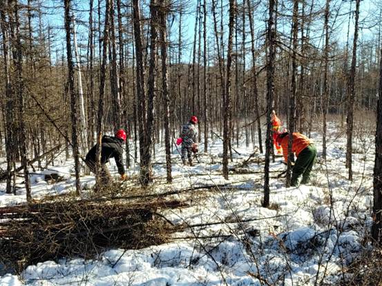 圖強林業(yè)局營林工人們在林間清理撫育枝丫(趙明 攝)