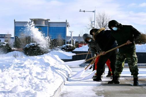 皚皚白雪中,190余名隊(duì)員不畏嚴(yán)寒,有的將冰層鏟起,有的則用鐵鍬將積雪運(yùn)至道路兩側(cè)不影響交通的地方。大家齊心協(xié)力逐段清理、有序推進(jìn)清雪工作,不到10:30就為附近干部職工群眾創(chuàng)造了一個(gè)安全、順暢、良好的生產(chǎn)生活環(huán)境。