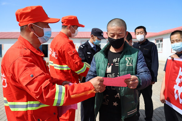 古蓮河露天煤礦組織志愿者深入礦區(qū)一線發(fā)放森林防火宣傳單(李云田 攝)