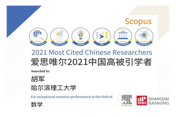 黑龍江經(jīng)濟(jì)網(wǎng)訊(黑龍集日報(bào)全媒體見習(xí)記者董廣碩 商祺)近日,全球信息分析公司愛思唯爾(Elsevier)正式發(fā)布了2021“中國高被引學(xué)者”(Highly Cited Chinese Researchers)榜單。哈爾濱理工大學(xué)自動(dòng)化學(xué)院院長、博士生導(dǎo)師胡軍教授在數(shù)學(xué)學(xué)科領(lǐng)域連續(xù)兩年入選高被引學(xué)者。本次全國共有140位學(xué)者入選本次數(shù)學(xué)學(xué)科領(lǐng)域榜單,黑龍江入選4位。胡軍教授蟬聯(lián)榜單展現(xiàn)了他在數(shù)學(xué)及相關(guān)交叉學(xué)科領(lǐng)域的重要貢獻(xiàn)和廣泛學(xué)術(shù)影響力。