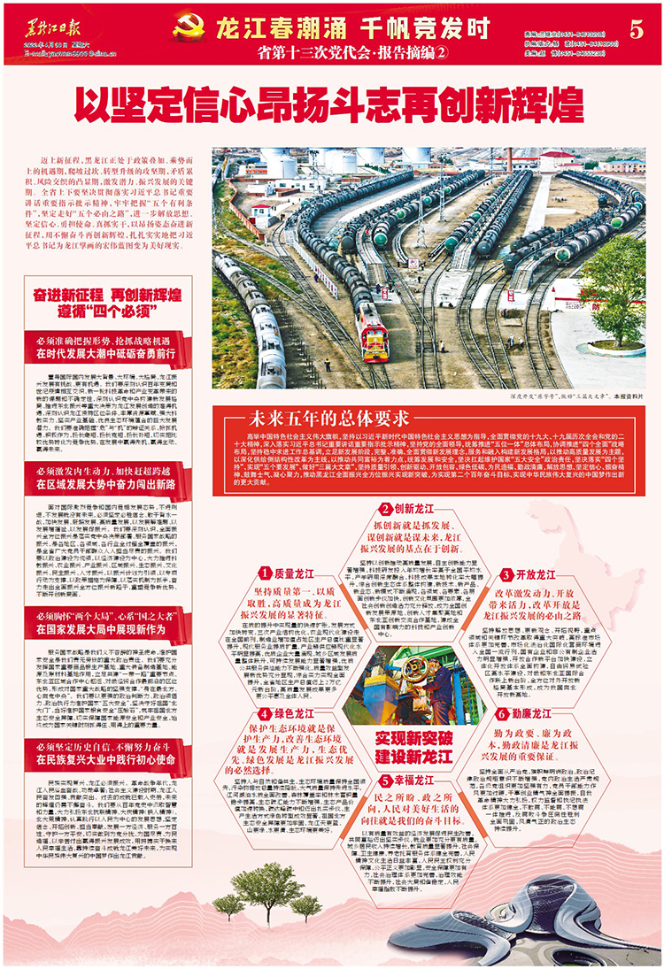邁上新征程,黑龍江正處于政策疊加、乘勢(shì)而上的機(jī)遇期,爬坡過坎、轉(zhuǎn)型升級(jí)的攻堅(jiān)期,矛盾累積、風(fēng)險(xiǎn)交織的凸顯期,激發(fā)潛力、振興發(fā)展的關(guān)鍵期。全省上下要堅(jiān)決貫徹落實(shí)習(xí)近平總書記重要講話重要指示批示精神,牢牢把握“五個(gè)有利條件”,堅(jiān)定走好“五個(gè)必由之路”,進(jìn)一步解放思想、堅(jiān)定信心、勇?lián)姑?、真抓?shí)干,以昂揚(yáng)姿態(tài)奮進(jìn)新征程,用不懈奮斗再創(chuàng)新輝煌,扎扎實(shí)實(shí)地把習(xí)近平總書記為龍江擘畫的宏偉藍(lán)圖變?yōu)槊篮矛F(xiàn)實(shí)。