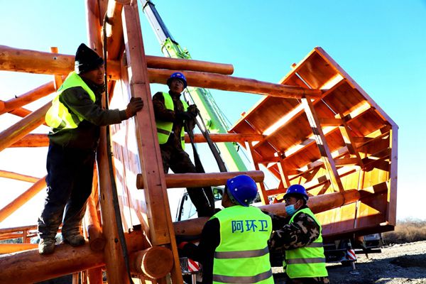 阿木爾林業(yè)局建設(shè)者安裝薩布素景點大門(王力 攝)