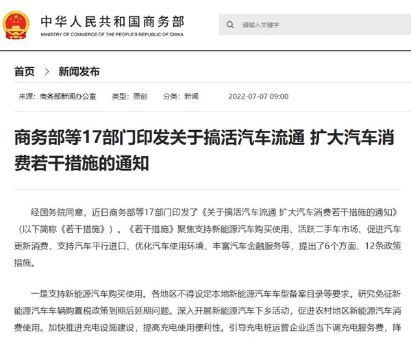 日前,商務(wù)部等17部門印發(fā)了《關(guān)于搞活汽車流通 擴(kuò)大汽車消費(fèi)若干措施的通知》,《措施》聚焦支持新能源汽車購(gòu)買使用、活躍二手車市場(chǎng)、促進(jìn)汽車更新消費(fèi)、支持汽車平行進(jìn)口、優(yōu)化汽車使用環(huán)境、豐富汽車金融服務(wù)等,提出了6個(gè)方面、12條政策措施。