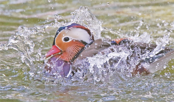 每天早晚,車春虎都會(huì)把準(zhǔn)備好的麻籽、玉米、面包蟲等鳥食撒到湖上、岸邊,鴛鴦撒著歡覓食。吃完食兒,它們不時(shí)水上舒展羽翅,撲騰戲水,湖面上水花四濺,生機(jī)盎然。車春虎介紹,這些鴛鴦?wù)跒槟线w越冬做著體能儲(chǔ)備,每年10月中下旬它們就會(huì)離開繁殖地哈爾濱,飛到溫暖的南方越冬。