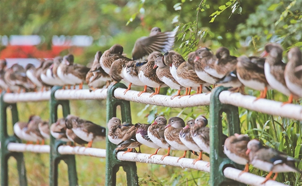 13日,哈爾濱市兆麟公園鴛鴦湖邊,近300只野生鴛鴦在湖邊欄桿上休息,密密麻麻排出近百米的“長(zhǎng)龍”。公園專職看護(hù)鴛鴦的職工車春虎介紹,目前在公園內(nèi)及周邊出生的小鴛鴦已經(jīng)長(zhǎng)大,加上從周邊濕地飛來(lái)的鴛鴦,每天早晚來(lái)鴛鴦湖覓食的鴛鴦數(shù)量接近300只,這一數(shù)量還在持續(xù)增長(zhǎng)?!邦A(yù)計(jì)國(guó)慶節(jié)前后,數(shù)量能超400只。”