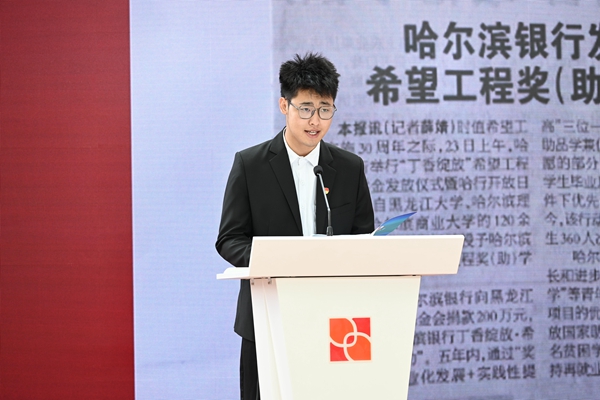 來自哈爾濱理工大學(xué)的獲獎(jiǎng)學(xué)生程同學(xué)代表全體獲獎(jiǎng)學(xué)生向共青團(tuán)、希望工程、哈爾濱銀行表示感謝,并表達(dá)了自己在課業(yè)之余會(huì)積極參加“丁香綻放·童心港灣”等志愿服務(wù)項(xiàng)目,把公益火種延續(xù)下去。