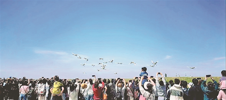 游客觀賞丹頂鶴野化放飛。