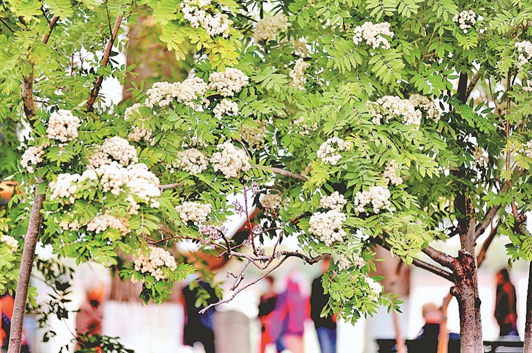 日前,哈爾濱市道里區(qū)松花江畔,四五棵花楸樹上,白色的花朵迎風綻放,非常美麗,吸引許多游人觀看、拍照。