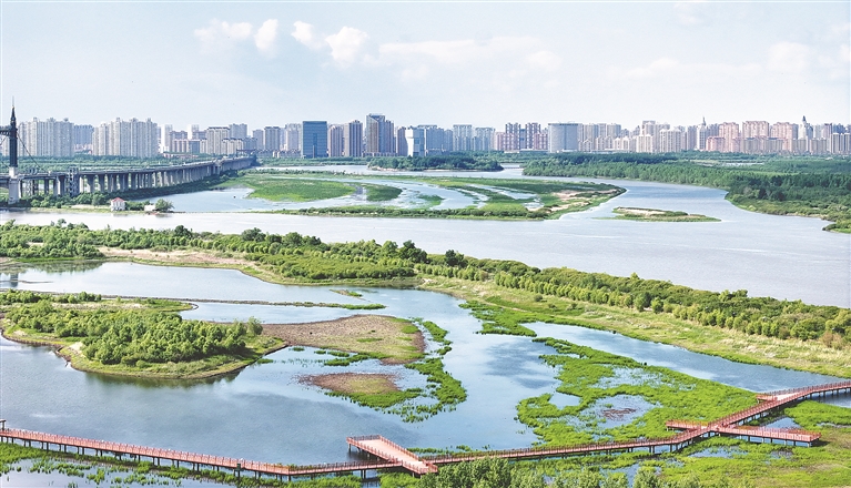 近日,初夏的松花江碧水清清、綠意盈盈,一塊塊大大小小的濕地星羅棋布,宛如一顆顆珍珠散落在松花江兩岸。傍晚,落日熔金,夕陽(yáng)余暉映云成霞,游船悠悠,鷗鳥翩翩,江景如畫。