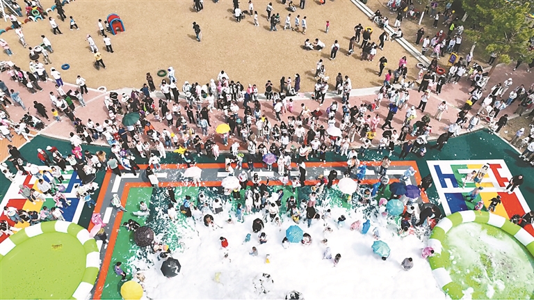 “彩虹泡泡派對”吸引眾多游客參與其中。本報(bào)記者 劉欣攝