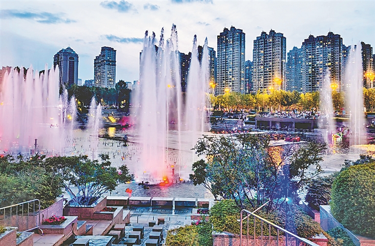 夏日夜晚,哈爾濱市群力金河公園音樂谷內(nèi),伴隨著悠揚的樂曲,大型噴泉“翩翩起舞”,與霓虹彩燈交相輝映,構成一幅美麗的畫面。