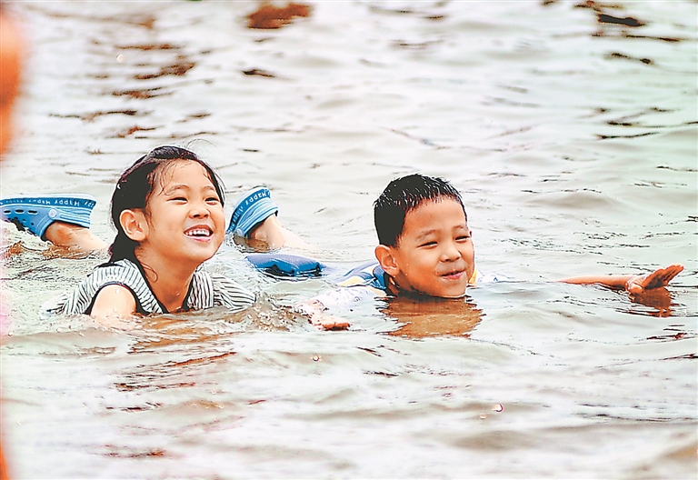日前,哈爾濱市江北公路大橋附近的公益沙灘浴場(chǎng)內(nèi),許多市民帶著孩子在戲水納涼。這處沙灘浴場(chǎng)面積有數(shù)百平方米,水中最深處只有半米多,周?chē)O(shè)置了隔離帶、安全網(wǎng)。孩子們盡情玩樂(lè),有的在學(xué)游泳、有的玩水槍、有的在堆沙子、有的在挖“水渠”,叫喊聲、歡笑聲不絕于耳。
