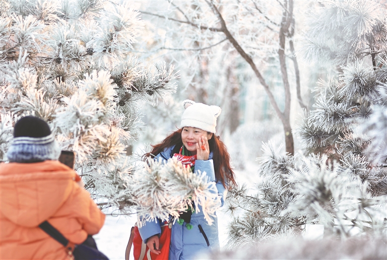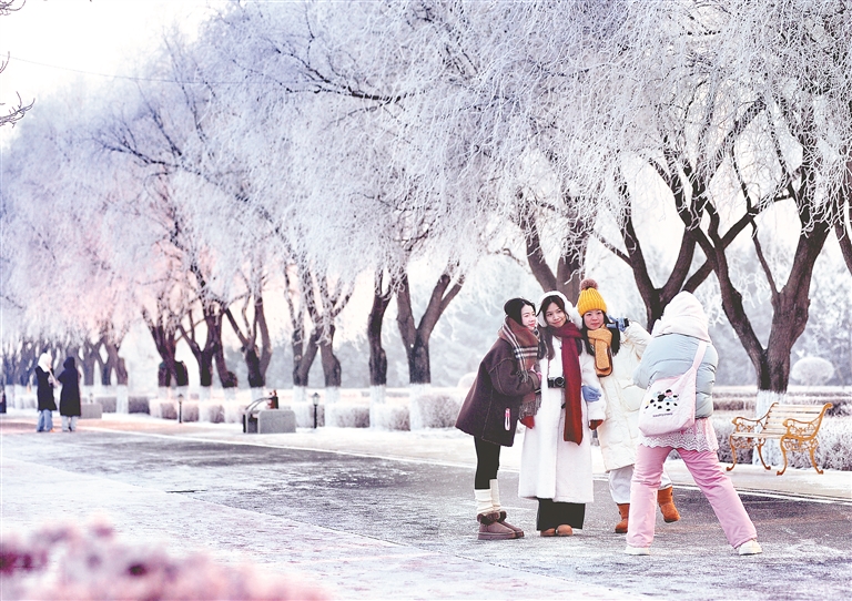 在松花江畔,一排排樹(shù)木都變成了白色,枝頭的冰晶反射著太陽(yáng)的光芒,景色迷人,走入其中,仿佛置身于童話世界。游客們一邊觀賞霧凇美景,一邊用手機(jī)拍下精彩瞬間。