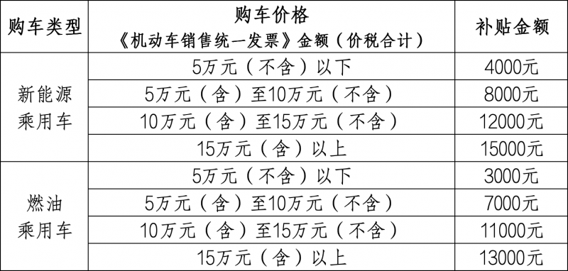 細(xì)則規(guī)定,消費者轉(zhuǎn)讓的舊車應(yīng)于2025年1月8日前登記在申請人名下。在購買新車時,按照《機動車銷售統(tǒng)一發(fā)票》金額(價稅合計),置換車輛為新能源乘用車新車的:5萬元(不含)以下每輛補貼4000元;5(含)-10萬元(不含)補貼8000元;10(含)-15萬元(不含)補貼12000元;15萬元(含)以上補貼15000元。如置換燃油乘用車:5萬元(不含)以下補貼3000元;5(含)-10萬元(不含)補貼7000元;10(含)-15萬元(不含)補貼 11000元;15萬元(含)以上補貼13000元。補貼資金用完活動即止。