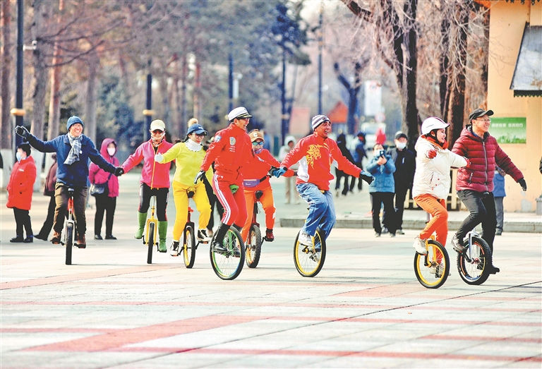 在哈爾濱市江畔斯大林公園內的小廣場上,許多人在練習騎獨輪車。在樹林旁,數(shù)十位老年人在跳民族舞。公園的人行道上,不時有成群的徒步者走過。