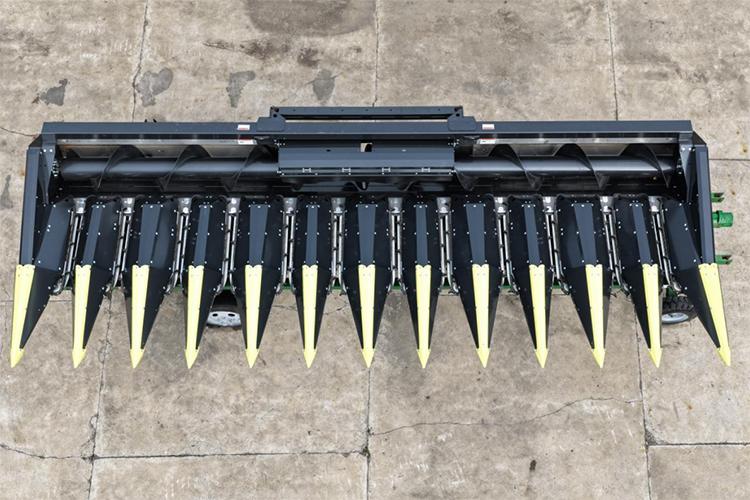 現(xiàn)場會上,最讓人駐足的是現(xiàn)場展示的意大利卓收割臺, 此次引入的卓收割臺,其自動摘穗板每行單元可實現(xiàn)自動開合且?guī)в袦p震功能,能根據(jù)玉米粗細靈活調節(jié)間隙,有效解決了其他品牌割臺無法對每行每株精準適配的問題;同時,收割臺的拉莖輥長度較其他品牌割臺增加 8 公分,讓割臺更貼合地面,在收獲倒伏玉米時作業(yè)角度更優(yōu),大幅減少 “跳棒” 現(xiàn)象。此外,卓收割臺的拉莖輥及刀片采用螺栓固定設計,可隨時調整位置或更換部件,避免了其他割臺因拉莖輥及刀片為一體式設計、損壞后需整體更換的弊端。